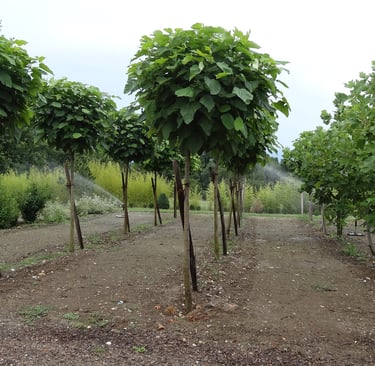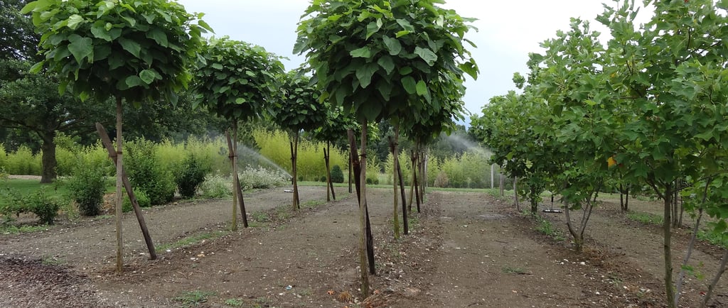 Quand le soleil tape fort et que l’on cherche un coin de fraîcheur, le catalpa déploie son feuillage large comme un parasol végétal. Avec ses grandes feuilles en cœur, ses fleurs légères et ses longues gousses pendantes, il a tout du géant bienveillant. Majestueux, facile à vivre et décoratif, il a sa place toute trouvée dans les jardins en quête d’ombre et de caractère. Originaire d’Amérique du Nord, le catalpa séduit par son allure généreuse et un brin exotique. Il forme rapidement une belle couronne arrondie, dense, qui offre une ombre bienvenue dès les premières années. Ses grandes feuilles vert tendre forment un véritable toit végétal, parfait pour installer un banc, une table ou simplement un coin de repos à l’abri du soleil. Mais le catalpa ne se contente pas d’offrir de l’ombre. En juin-juillet, il se couvre de grappes de fleurs blanches délicatement mouchetées de jaune et de pourpre. Une floraison légère et parfumée, qui attire les abeilles et transforme l’arbre en spectacle vivant. Puis viennent ses longues gousses, fines et pendantes, qui ajoutent une touche insolite tout au long de l’automne et de l’hiver. Très peu exigeant, le catalpa pousse dans presque tous les sols, pourvu qu’ils ne soient pas trop secs en été. Il aime les expositions ensoleillées, mais supporte aussi la mi-ombre. Sa croissance rapide en fait un excellent choix pour créer rapidement une zone ombragée, même dans un jardin jeune. Et bonne nouvelle : il ne demande presque aucun entretien, si ce n’est de retirer les branches basses s’il est planté près d’un passage. Il existe aussi une version plus compacte, le catalpa boule (Catalpa bignonioides 'Nana'), idéale pour les petits jardins, les allées ou les jardins urbains. Sans fleurs ni gousses, mais avec le même feuillage large et décoratif, il forme une belle sphère verte tout au long de la belle saison. Avec le catalpa, c’est un peu de fraîcheur, d’élégance et de nonchalance que l’on plante au jardin. Il invite à ralentir, à s’installer dessous, à lire, rêver ou simplement observer les jeux de lumière dans ses feuilles. Envie d'un Catalpa pour embellir votre jardin ? Retrouvez nos prix sur la page Pépinière !